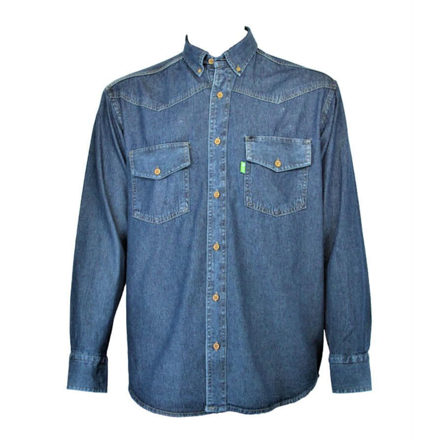 ELABORADO EN JEAN 100% ALGODÓN, 7 ONZAS. BOLSILLO SUPERIOR DE PARCHE CON TAPA Y BOTÓN. TALLAS DE LA S A LA XL.